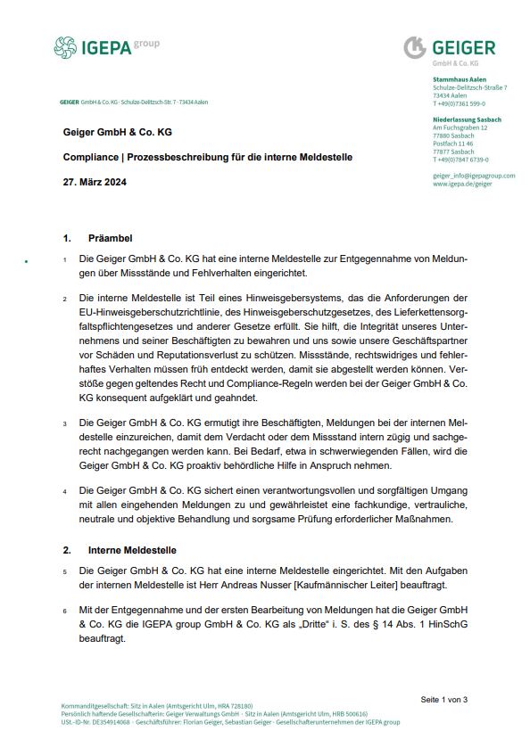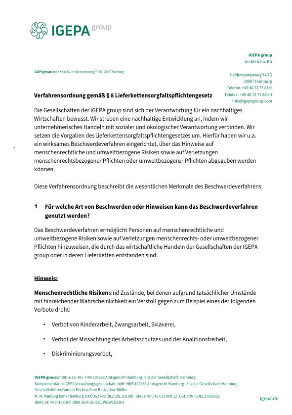 Die IGEPA group GmbH & Co. KG sichert zu, dass keiner Person, die von den externen und/oder internen Kontaktmöglichkeiten Gebrauch macht, ein Schaden oder eine andere Benachteiligung erwächst.