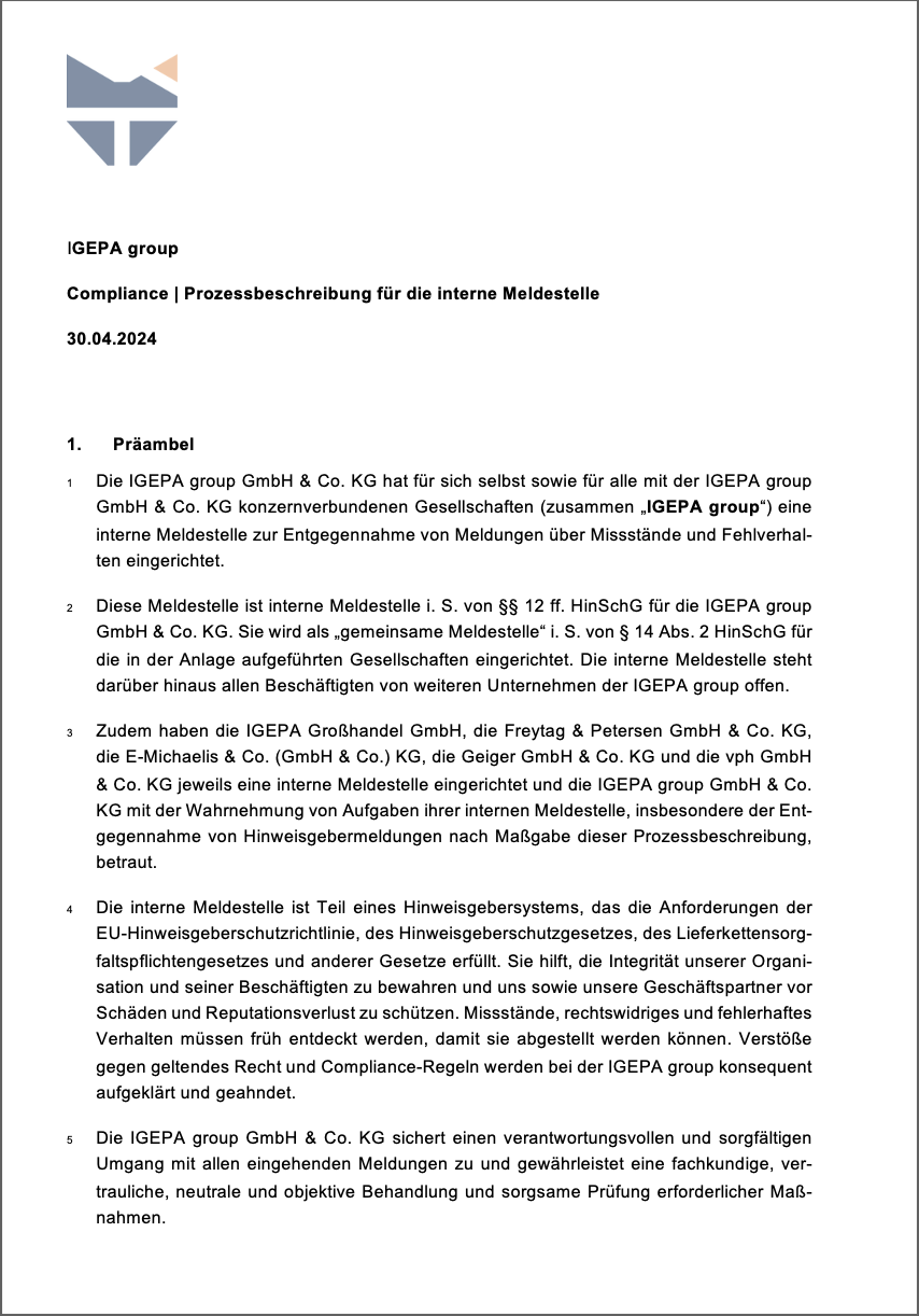 Die IGEPA group GmbH & Co. KG sichert zu, dass keiner Person, die von den externen und/oder internen Kontaktmöglichkeiten Gebrauch macht, ein Schaden oder eine andere Benachteiligung erwächst.