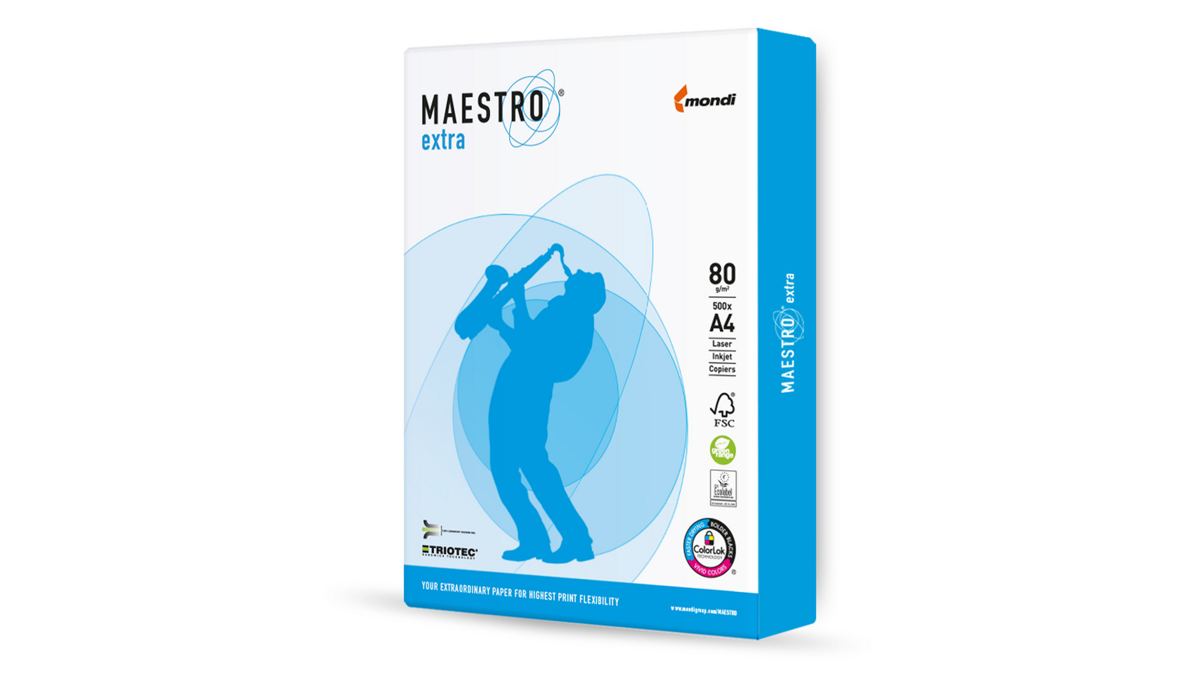 MAESTRO® extra ist ein Premiumpapier mit sehr hoher Weiße. Es ist perfekt für den Druck von Text und farbigen Grafiken geeignet und garantiert starke Farbkontraste. MAESTRO® extra ist in vielen verschiedenen Grammaturen und Formaten erhältlich und daher für alle Büroanwendungen geeignet.