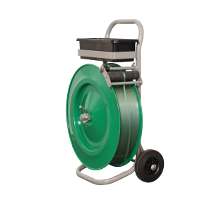 Für PP- und PET-Band, 406 mm Kernaufnahme, mit stabiler Bandablaufbremse, praktischer Kunststoff-Ablagekasten