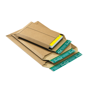 Versandtasche aus brauner Wellpappe mit Selbstklebeverschluss und Aufreißfaden