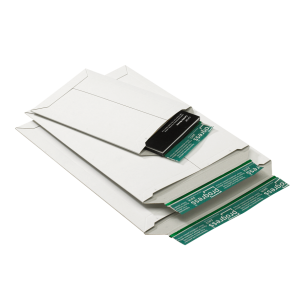Versandtasche aus weißer Wellpappe mit Selbstklebeverschluss und Aufreißfaden